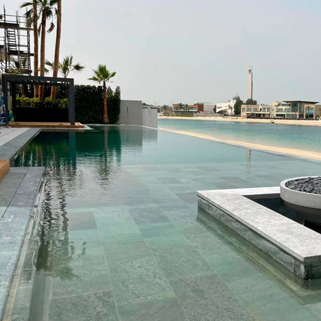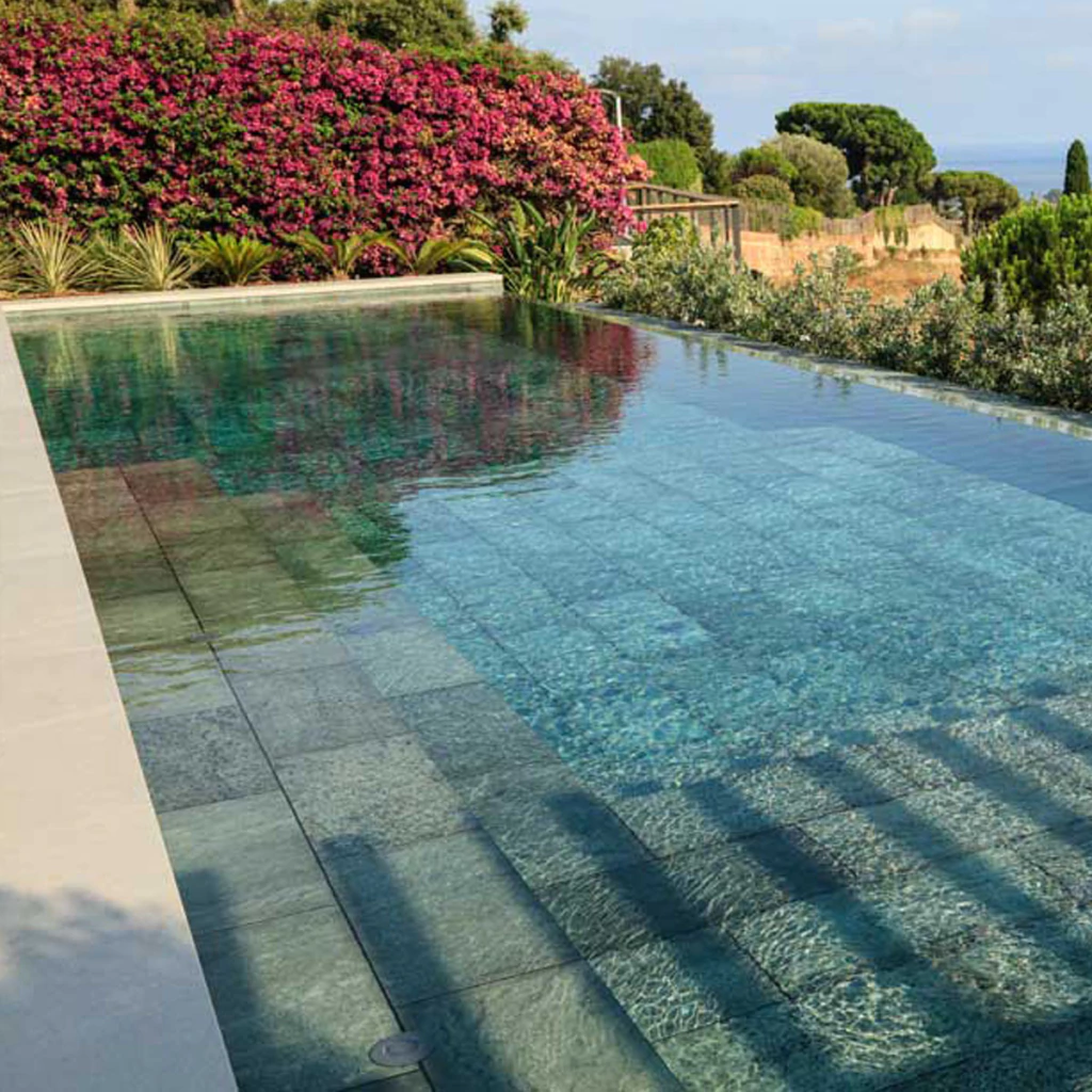 Tresor Bali es el color del gres porcelánico Rosa Gres más exótico. Se inspira en las piedras verdosas de Sukabumi. Su textura nos revela una tonalidad del agua turquesa, brillante y refrescante